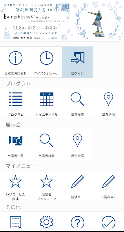 Cette application est une application de résumé électronique pour la 45e conférence de recherche de la Convalescent Rehabilitation Ward Association à Sapporo.