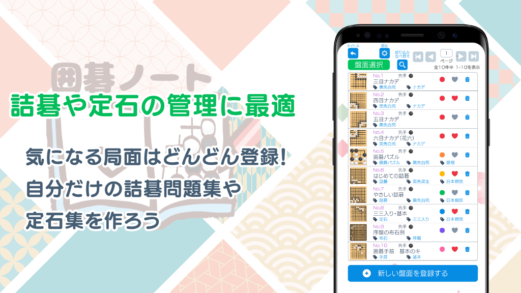 "Go Note" est une application gratuite qui vous permet d'enregistrer librement les problèmes de Go et joseki, et de gérer et d'enregistrer les enregistrements de plateau et de jeu.