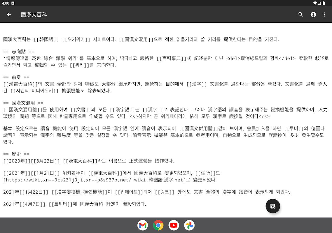 《國漢大百科》, qui peut être utilisé avec cette application, est un site Wikiwiki qui vise à créer une encyclopédie contenant toutes les connaissances et informations du monde en utilisant une notation utilisant à la fois des caractères coréens et chinois, appelée « coréen-coréen ». usage mixte'. Je le recommande à tout le monde, mais je recommanderais particulièrement 《國漢大百科》 à ceux qui tombent dans les conditions suivantes.