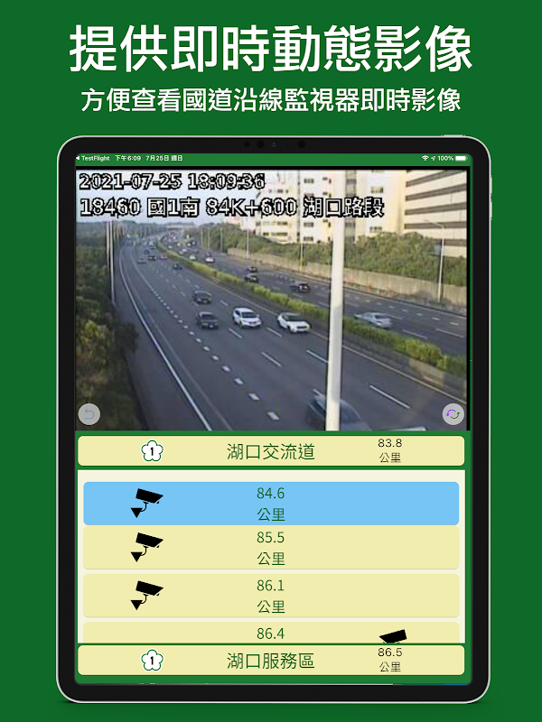 - 監視影像:提供各國道交流道間的即時監視器(CCTV)影像