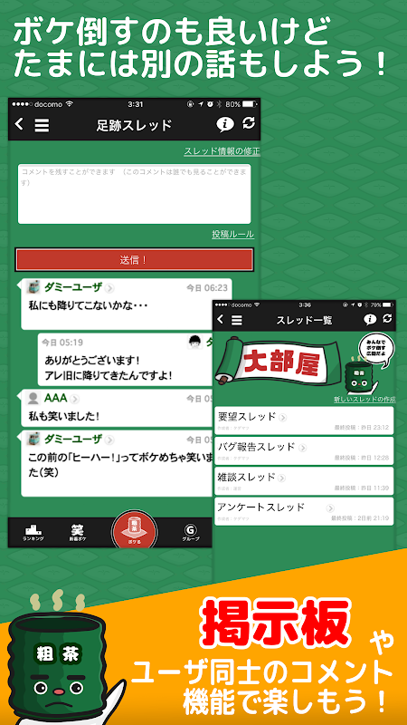 このアプリは【大喜利】を中心にした【ソーシャルアプリ】となっています。純粋にボケてランキングトップを目指すだけの遊び方をする人には不向きな可能性があります。あらかじめご了承ください。