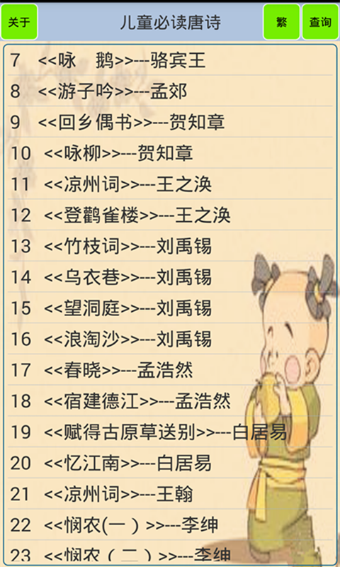 "Tang Poems for Children" vise à aider les jeunes enfants à apprendre des poèmes anciens. Le logiciel contient un total de 80 poèmes classiques des dynasties Tang, Song, Ming et Qing. Ces poèmes anciens sont incontournables pour les élèves du primaire chinois. Tous les poèmes anciens sont fournis avec du pinyin et de la lecture, ainsi que des annotations de poèmes. Le jeu rempli de poésie est une caractéristique majeure du logiciel, qui peut non seulement accroître l'intérêt pour la mémorisation, mais aussi apprendre les caractères chinois. De plus, le logiciel fournit également un lien de quiz pour consolider ce que vous avez appris, et le mode de requête peut interroger des poèmes anciens par auteur, titre et verset.