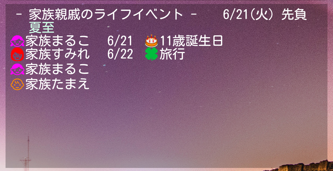 Nous vous informerons des jours importants de votre famille, vos proches et vos amis ! Affiche l'âge depuis l'anniversaire, l'obtention du diplôme de l'école primaire, secondaire et secondaire, la célébration de l'année de la longévité, l'anniversaire de mariage, l'anniversaire de la mort et l'anniversaire, le service commémoratif (affaires juridiques)