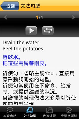 由會話中選錄實用句型,由專業老師解說文法與句型用法,搭配互動式練習與測驗(代換練習與克漏字測驗),讓您精熟重點文法與句型。