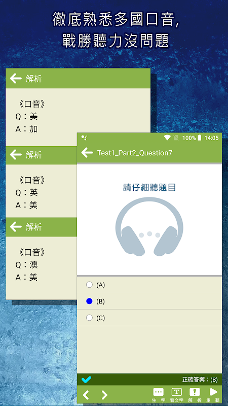 Contient deux nouveaux tests complets de simulation super réalistes du TOEIC 2018 (400 questions au total), avec des explications détaillées, des traductions et des enregistrements de tests d'écoute originaux. Si vous ne comprenez pas, vous pouvez le répéter jusqu'à ce que vous compreniez.