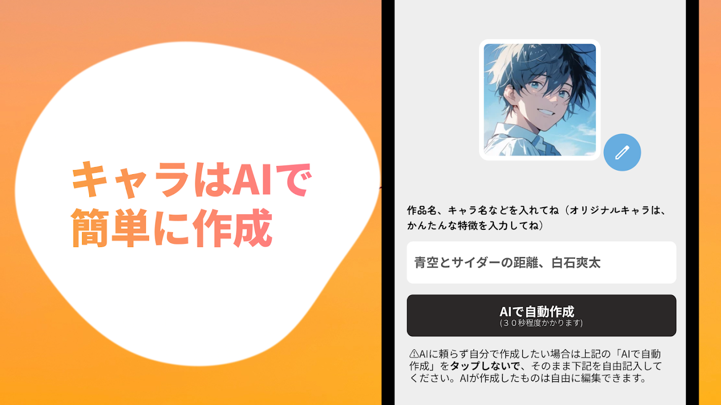 "Oshi Novel" est une application révolutionnaire qui permet à chacun de créer facilement un roman de rêve avec son "favori". Aucun réglage compliqué ou opération difficile n'est requis. L’IA reproduira fidèlement vos recommandations et vous aidera à créer votre propre histoire originale.