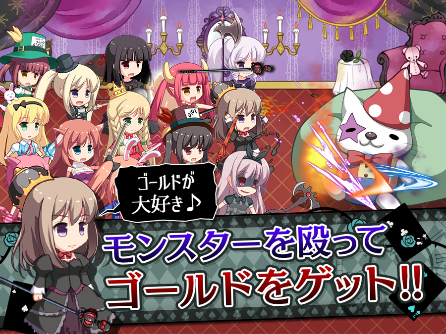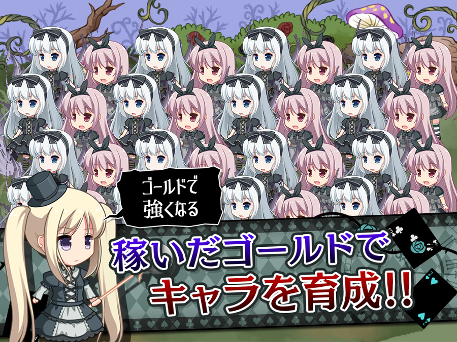 手軽なバトルがハマる放置育成アプリ♪ アリスと不思議な国でゴールドを稼ぎ、 次々に出てくるモンスターを駆逐せよ!