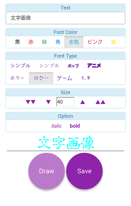 入力した文字を様々なフォントで画像化します。画像化したファイルはローカルに保存できるので、他アプリで使用することができます。
