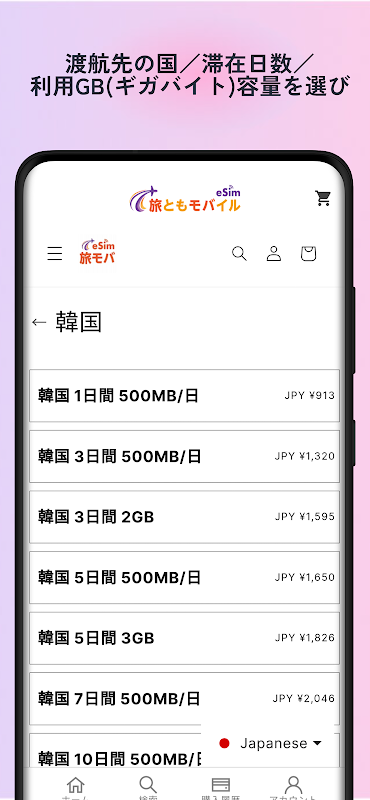 Pas besoin de location de WiFi ou de carte SIM ! Application de navigation pour « Tabitomo Mobile », une boutique de vente d'eSIM prépayée exclusivement pour la communication de données à l'étranger