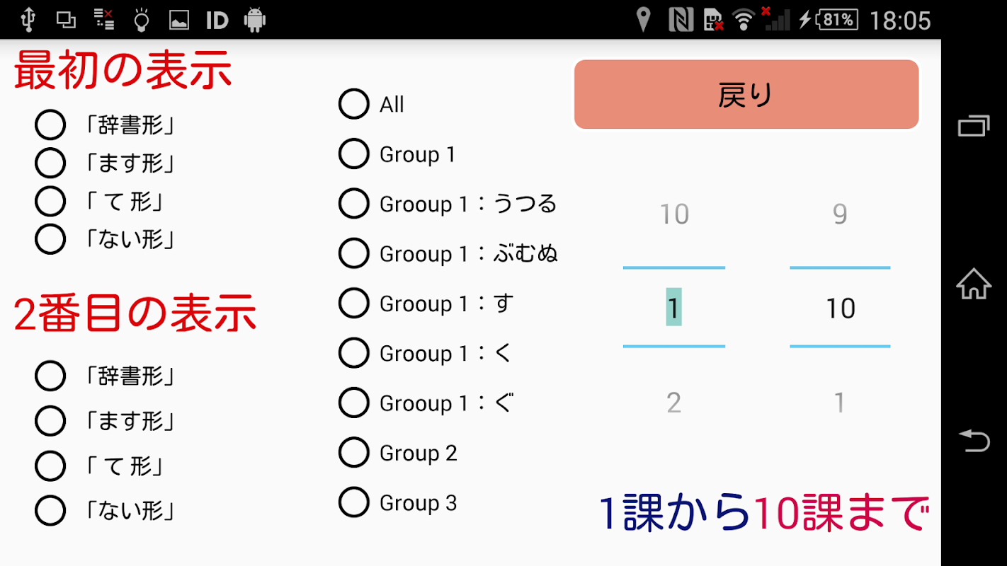日本語初級者向けのフラッシュカード型の動詞活用練習アプリです。 「辞書形」「ます形」「て形」「ない形」の相互変換練習ができます。7インチ、10インチタブレットに対応しました。