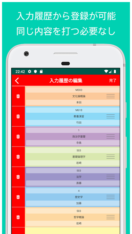 シンプルで見やすくて、直感操作で使いやすい新時代の時間割アプリ入力履歴から登録でき、同じ内容を打ち直す必要がありません。いくつでも時間割が作成できます。