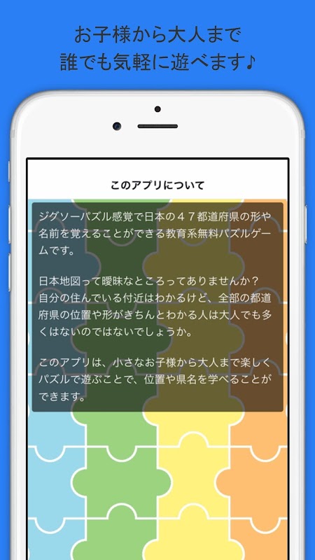 このアプリは、小さなお子様から大人まで楽しくパズルで遊ぶことで、位置や県名を学べることができます。