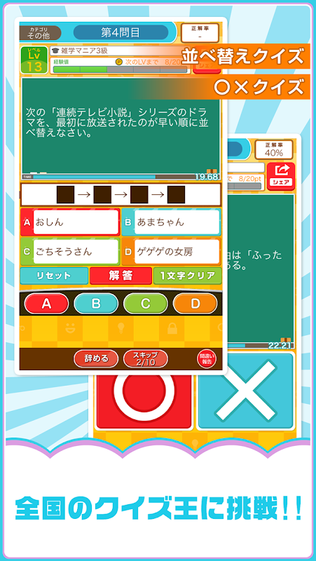四択、穴埋め、連想、並べ替え、○×など、様々な形式のクイズゲームで遊べます!