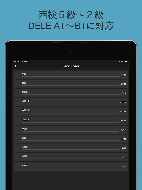 スペイン語学習者(初級〜中級)にとっての重要単語を学ぶためのアプリです。約1600語収録、スペイン語検定(西検)6級〜4級、 DELE:A1〜B1