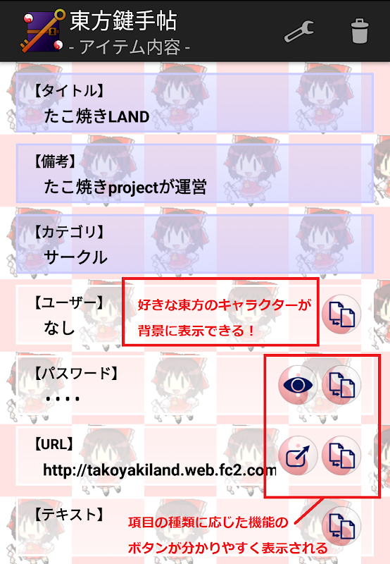 【東方鍵手帖】は東方キャラのアイコンが使用できる、パスワード管理ツールです。 1つのアイテムに対して、グループ管理や自由な見出しで上限ない項目の登録が可能です。