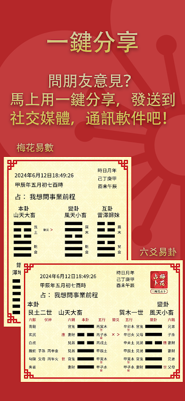 ・Divination des fleurs de prunier + Divination Liu Yao : prend en charge deux méthodes de divination traditionnelles, prenant en compte les besoins des débutants et des avancés.