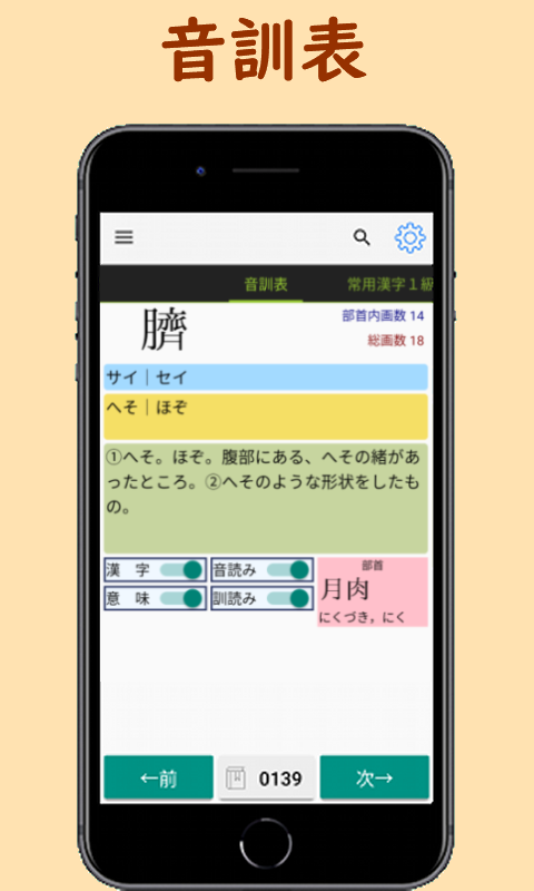 漢字・読み・意味などを、表示/非表示を設定できます。