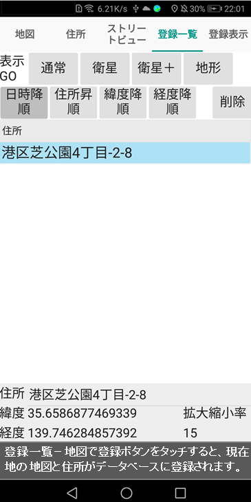 4.登録一覧は、登録した地図の一覧です。日時降順(新しい登録から古い登録へ)、住所昇順(数字、ひらがな、漢字)、緯度降順(北から南へ)、経度降順(東から西へ)でソートできます。表示GOで登録された地図が表示できます。