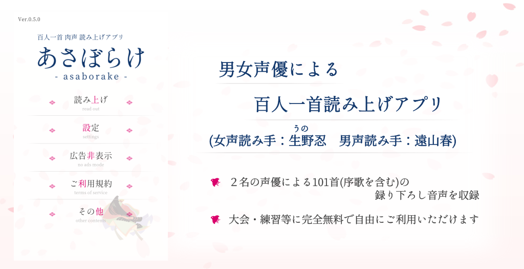 À propos de 百人一首 肉声読み上げアプリ 「あさぼらけ」