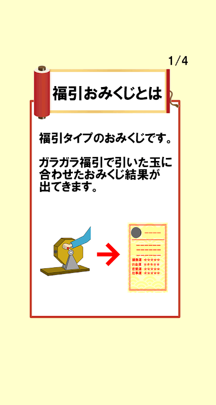 1日に何度でも挑戦できる福引おみくじです。1つの端末を使って皆でわいわい楽しんで挑戦できる福引おみくじです。