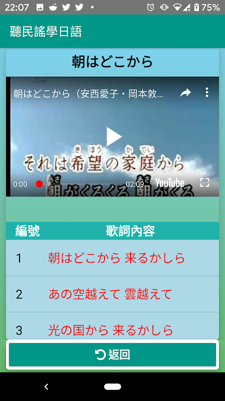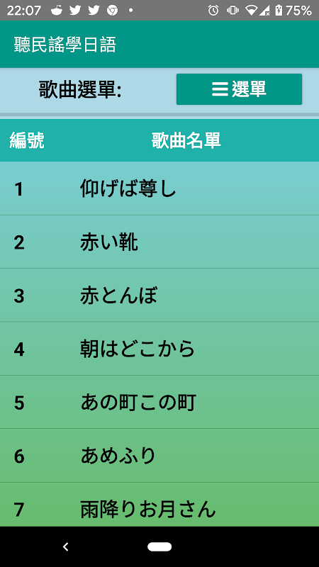 在這個APP中,你將學習由日本文化廳與日本家長協會選出的101曲「日本の歌百選」過。 (有些歌詞很短,適合日語初學者學習,強化對五十音的印象。有些是台灣學習者早已熟知的旋律,搭配優美雋永的日文歌詞, 請花點時間細細品味這些歌詞的意義,如果您使用這APP,請給予回饋,以便爾後提供更多日語學習的功能)