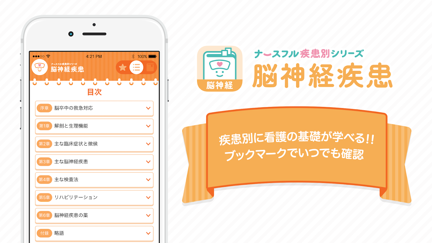 看護師さんが押さえておきたい「脳神経疾患」の看護の基礎をいちから学べるアプリ♪わかりやすい解説&使いやすい機能で、多忙な看護師さんのお勉強をしっかりサポート!