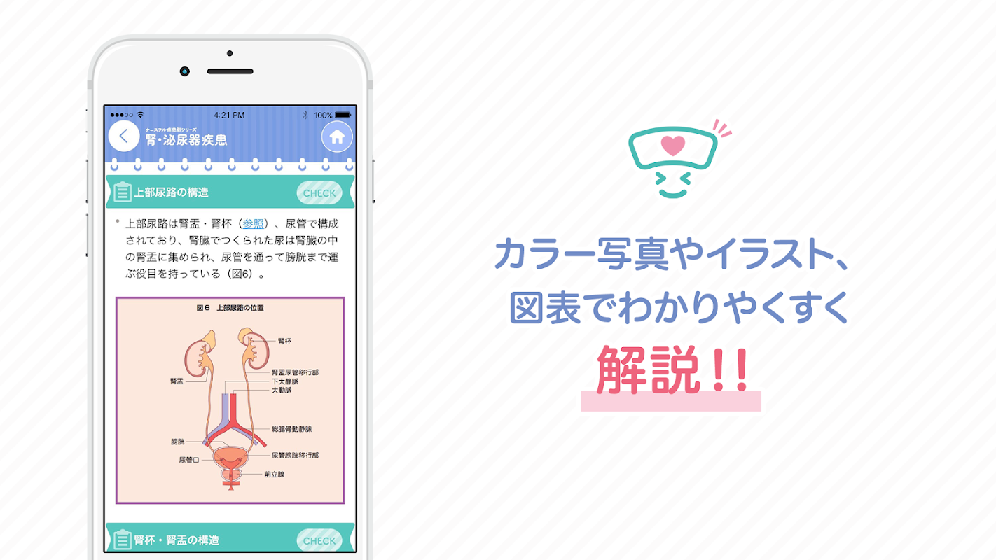 看護師さんが押さえておきたい「腎泌尿器疾患」の看護の基礎をいちから学べるアプリ♪わかりやすい解説&使いやすい機能で、多忙な看護師さんのお勉強をしっかりサポート!
