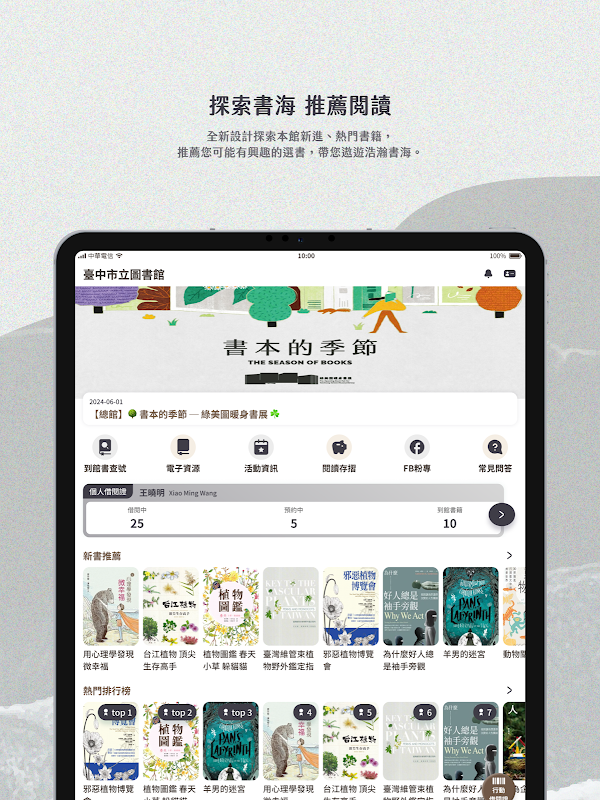 Une nouvelle version de l'application Taichung City Library est désormais disponible ! ※Pour maintenir la sécurité de vos informations, nous vous recommandons de mettre à jour le système d'exploitation de votre téléphone vers la dernière version.