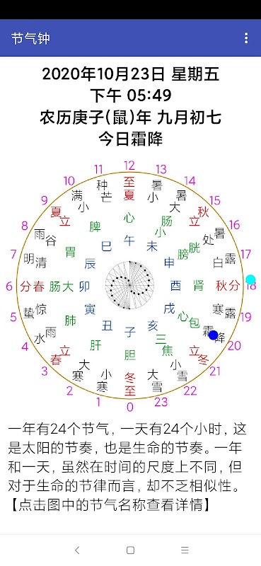 Il y a 24 termes solaires par an et 24 heures sur 24. C'est le rythme du soleil et le rythme de la vie. Si une année et un jour sont différents selon l'échelle du temps, les similitudes ne manquent pas dans le rythme de la vie. La médecine traditionnelle chinoise croit que le qi et le sang du corps circulent le long des méridiens, comme les marées, avec un rythme. Le jour parcourt cinquante degrés, dont vingt-cinq degrés en yang, les vingt-cinq autres degrés en yin, cinquante degrés en semaine. La "marée" du mouvement du qi et du sang atteint différents méridiens à des moments différents, et douze heures correspondent à douze méridiens. "Tidehead" contient une énergie extraordinaire, qui a des fonctions de réparation et de guérison pour le corps humain. Pendant le processus de réparation, les parties correspondantes du corps des méridiens peuvent avoir des réactions physiologiques, telles que la «tête de marée» atteignant le méridien pulmonaire de 3 à 5 heures du matin. Si le poumon est malade, la toux et l'asthme se produiront à ce moment. De même, le choix du bon moment pour le traitement aura également un effet multiplicateur.