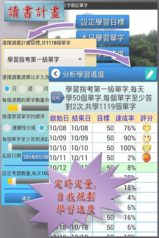 Apprentissage du vocabulaire personnalisé, chronométré et quantitatif, avec des cycles quotidiens, hebdomadaires ou mensuels, et une difficulté et une quantité de vocabulaire auto-planifiées. Et vérifiez l'état d'apprentissage grâce à la fonction d'analyse des progrès d'apprentissage. Veuillez vous référer à la section plan de lecture