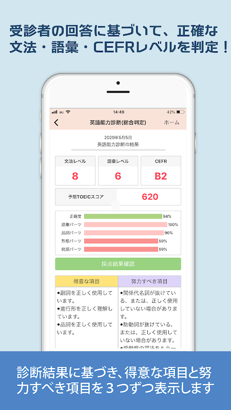 ■ En seulement 10 minutes, le moteur d'IA de raisonnement linguistique détermine avec précision votre grammaire, votre vocabulaire, votre niveau CECR et votre score TOEIC attendu !
