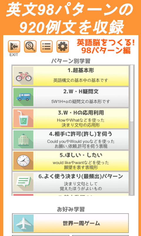 C'est une application de jeu d'apprentissage en anglais qui pense dans l'ordre des mots anglais. Complètement libre! Créons un cerveau anglais tout en nous amusant à résoudre 98 modèles et 920 exemples de phrases de phrases anglaises souvent utilisées dans les conversations en anglais avec des problèmes de jeu!
