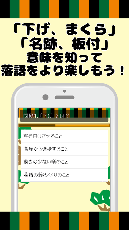 クイズに答えて、落語の用語を学ぼう!「大喜利」「まくら」といった言葉はもちろん「曼荼羅」「板付」といったマニアックな用語の意味を知ってより落語を楽しもう!!