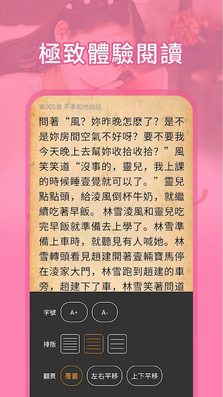 言情小說書庫智能添加書籍,快捷刪除小說。閱讀護眼背景多選擇,種仿真翻頁模式選擇。小說文字簡繁字體支持一鍵切換功能。