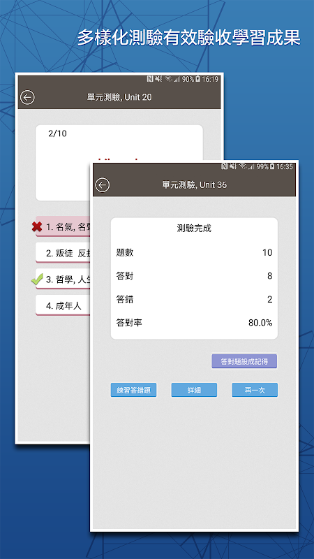 專為增強學習效果設計的記憶練習和測驗練習,讓您背單字更有效率也更容易!支援連續播放及背景播放功能,讓您有效利用零碎時間增強自己的單字功力。本 app 內容翔實,功能實用,是您提升英文單字實力最佳工具!