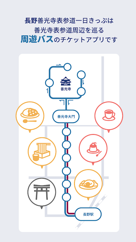 「長野善光寺表参道一日きっぷ」は善光寺・長野駅周辺を便利に観光できる、周遊バスチケットにごはんとお楽しみがついたアプリです。