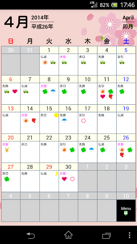 このアプリは、和暦にもとづき、暦注(六曜、十干十二支、十二直、二十八宿)と選日(一粒万倍日、天赦日、不成就日、天一天上、天恩日、十方暮)をカレンダー上に見やすく表示したものです。