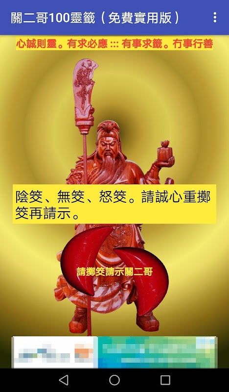 忠義人士首選的《關二哥100靈籤》。用此手機應用程式,可隨時隨地求籤解惑,趨吉避凶。有求必應,心誠則靈。