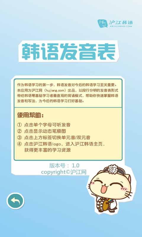 作为韩语学习的第一步,韩语发音对今后的韩语学习至关重要。本应用为沪江网(hujiang.com)出品,以段行分明的发音表形式带给韩语零基础学习者最直观的背诵模式,帮助你快速掌握韩语发音和写法,为今后的韩语学习打好基础。