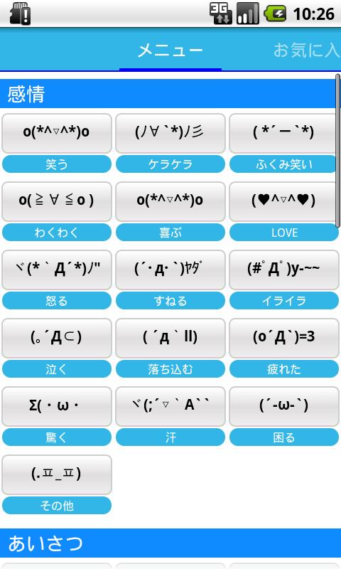 かわいい顔文字が簡単に入力できる!便利な機能がいろいろあるよ ・オリジナルの顔文字が登録可能 ・いらない顔文字は削除できる ・特殊文字フィルター機能