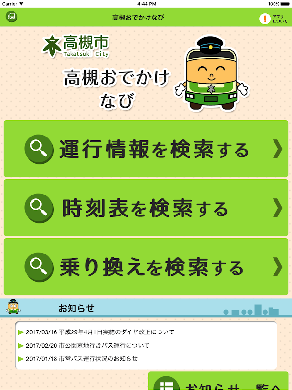 運行情報やダイヤ改正など、高槻市からのお知らせを閲覧できます。