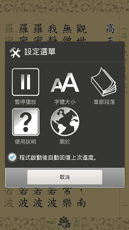 系統設計上除了念誦位置引導、自動翻頁、字體大小調整,也提供了次頁銜接的預覽功能,每頁最後一句為次頁的第一句,如此在翻頁時減少了視覺上或意識上經句銜接上的問題。更多的小細節還需要您下載使用體驗!