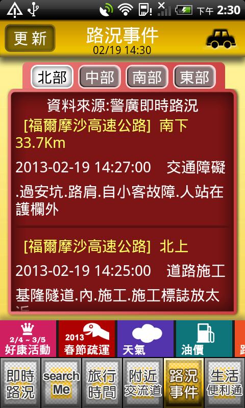 ● [路況事件]功能,提供高快速路目前路況事件列表。