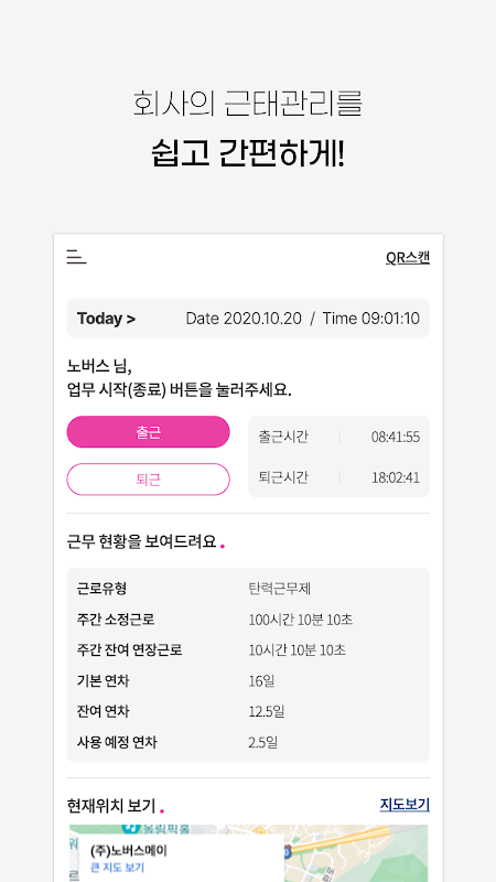 La gestion des heures de travail est une application certifiée par la Korea Communications Commission, et vous pouvez gérer la gestion des déplacements et les informations d'absence du bureau avec une application mobile.