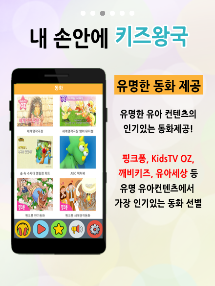 우리 아이에게 동요, 동화,만화를 보여주고싶을 때!내 손안에 키즈왕국 하나면 끝!아이에게 유익한 동요, 동화들만 선별하여 제공합니다.