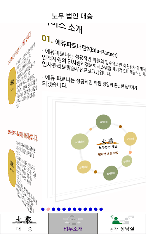 2000년이후 한국사회의 노동분야는 새로운 제도가 끊임없이 도입되고 있습니다. 주5일제, 차별금지제도, 산별노조등 새로운 변화에 기업과 근로자는 다른 경쟁자보다 한발 먼저 대응하고 변화해야한 하는 것이 냉엄한 현실입니다. 노무법인대승은 변화하는 법과 제도에 선제적으로 대응하여 노동분쟁을 예방할 수 있는 인사노무컨설팅과 노동법률에 관한 경험과 능력을 가지고 있습니다.
