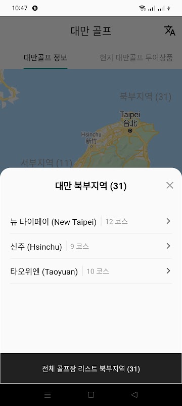 - 지도에서 대만의 동/서/남/북 각 지역별로 골프장 정보를 확인 할 수 있습니다