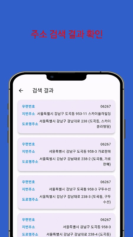 Vous pouvez facilement rechercher des adresses par dong/eup/myeon, nom de route ou code postal. Si vous regardez les résultats de la recherche, vous pouvez immédiatement vérifier l'adresse du nom de la route (nouvelle adresse, nouvelle adresse, etc.), l'adresse du numéro de rue et le code postal.