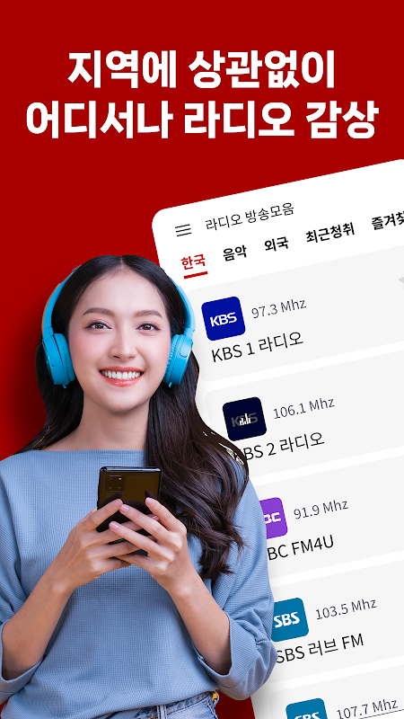 - SBS Power FM, SBS Love FM, KBS 1 Radio, KBS 2 Radio Happy FM, KBS 3 Radio, KBS Classic FM, KBS Cool FM, KBS Korean Broadcasting, KBS World CH1, KBS World CH2, KBS World Music, MBC Standard FM , MBC FM4U, YTN News FM, Radio FM EBS, Radio en langue étrangère EBS, OBS Gyeongin FM, Gyeongin Broadcasting iFM, CBS Standard FM, CBS JOY4U, TBS Traffic Broadcasting FM, FEBC Far East Broadcasting, BBS Buddhist Broadcasting, BTN Buddhist Broadcasting, CPBC Peace Broadcasting, WBS Original Sound Broadcasting, Community Radio, Gwangju English eFM, Busan English eFM, Gugak FM, Defence FM, AFN FM, Arirang Radio, Radio Korea AM, Radio Seoul AM, RFA Free Asia Broadcasting, etc. comme 2000 radios et radios musicales étrangères détenant plus de