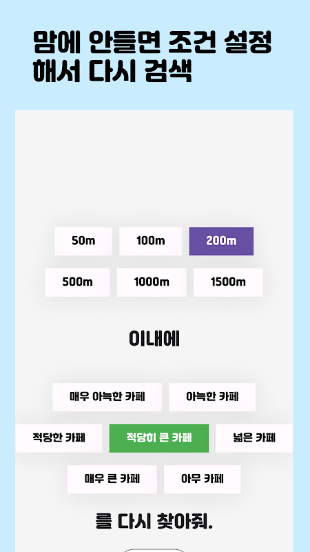 - You can search for coffee shops by setting a distance such as 100m or 300m.